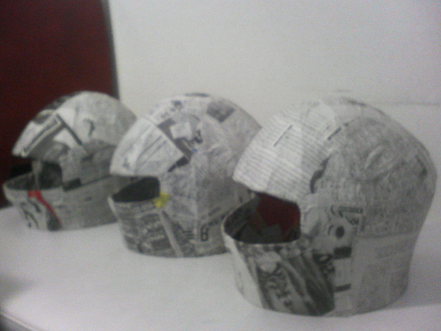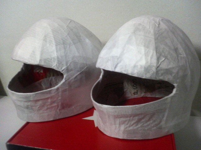 仕上げは和紙を表面に貼り付けてみた。そしてそれが乾く前に丸み等の形を整えヘルメット作成第1章の終わり。。。
