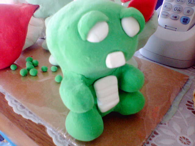 その日は、乾燥させる為にそのまま放置。。。後ろに転がっている緑色の鼻ク●みたいな物は手に付けるもので後から糊付けしようかと思って作ったもの。。。